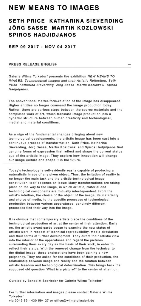 New Means to Images (group show), Galerie Wilma Tolksdorf, Frankfurt am Main, DE, 2018. From left to right: Jörg Sasse, Seth Price, Jörg Sasse and Martin Kozlowski.
